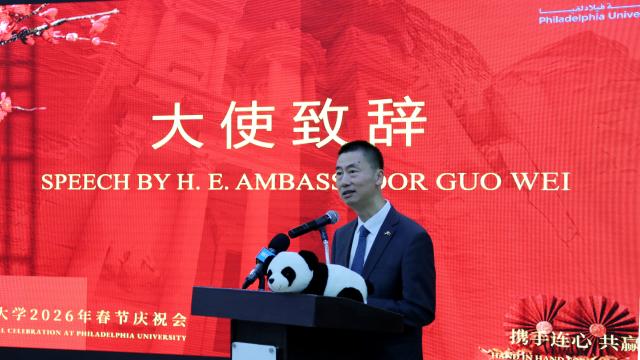 郭伟大使在致辞中表示,中约传统友谊深厚,人文合作基础牢固。费城大学是约旦首个设置汉语与中国文学本科专业、中文专业硕士点和汉语水平考试机网考点的高校,费城大学孔子学院成为促进中约教育文化交流与民心相通的重要平台,使馆将继续支持费城大学持续拓展中文教育、开展中约学术交流和青年交往,为推动文明交流互鉴走深走实做出更大贡献。